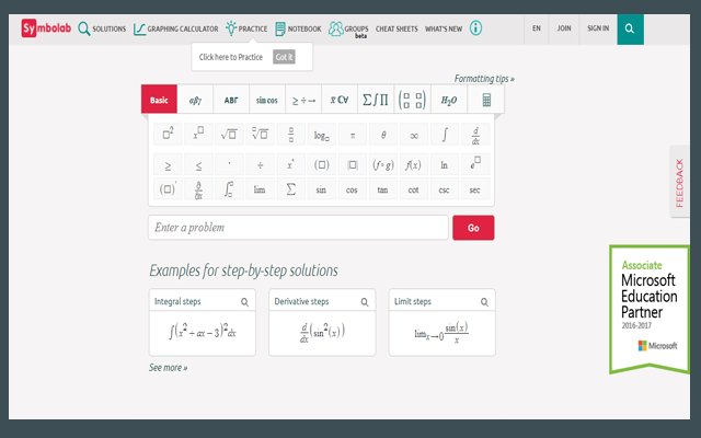 يستخدم symbolab البحث الدلالي لفهم وإعطاء حلول خطوة بخطوة لموضوعات تتعلق بالجبر، والحساب المثلثي، والإحصاءات، وموضوعات حساب التفاضل والتكامل. وهناك قسم للمعادلات الكيميائية كذلك.